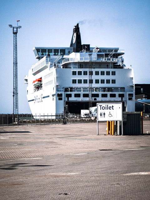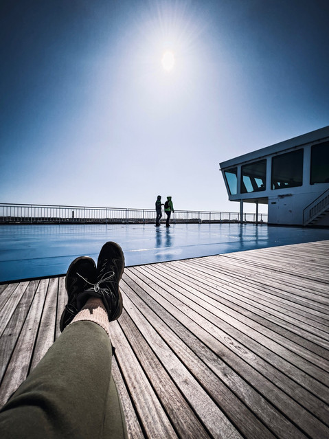 Nach dem Einschiffen mal eben das Schiff erkunden - geht schnell, ist ja nicht so groß. Das hätte ich mir ehrlich gesagt ein bisschen größer gewünscht, denn die Passage, die wir fahren, ist ja für seinen Seegang bekannt. Ich habe mir gegen Übelkeit solche Akupunkturbänder bestellt. Stelle beim Anlegen dann aber fest, dass die für Kinder sind. So viel zum Thema Vorbereitung…😇😂 Es ist super windig und selbst hier im Hafen sind schon richtig hohe Wellen. Naja, ich werde es überleben und chille erst noch mal ein bisschen im Windschatten in der Sonne.