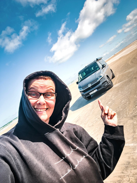 Um 6:30 Uhr sitze ich in meinem Bulli. Der Camper ist gemietet. Auch da keinen weiteren Plan, noch nie mit gefahren, geschweige denn drin übernachtet, … passt schon. Bei schönstem Wetter geht es Richtung Dänemark. Ich liebe es ja, im Auto möglichst hoch zu sitzen, den Überblick und den Ausblick zu haben. Hier sitzt man tatsächlich wie im Sofa, das Teil macht echt Spaß. Ich bin extra früh losgefahren, um meine Auszeit am Strand von Lökken gebührend einzuleiten. Man kann dort offiziell mit dem Auto längs cruisen, was total Laune macht. Aber es ist hier heute echt windig, sehr windig… Ich mag noch nicht wirklich an die Fährüberfahrt denken, die mir bevorsteht.