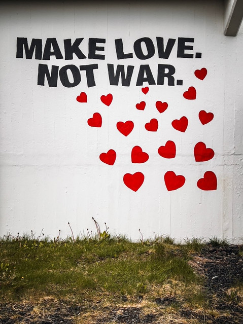 Ich schwinge mich ins Auto Richtung Golden Circle. Das Autofahren macht bei dem Wetter nicht wirklich Spaß, wenn einen ständig irgendwelche Sturmböen zur Seite drücken. Aber die Isländer sind entspannt, meinen, das wäre nur ein mittlerer Sturm. Dann möchte ich den starken nicht wirklich erleben… Ich nehme mal wieder kleine Wege irgendwo durch die Pampa und auf einmal sehe ich Banksys an einer Hauswand. What??! Wie kommen die denn hier hin? Es ist das War and Peace Museum, was aber leider zu hat.