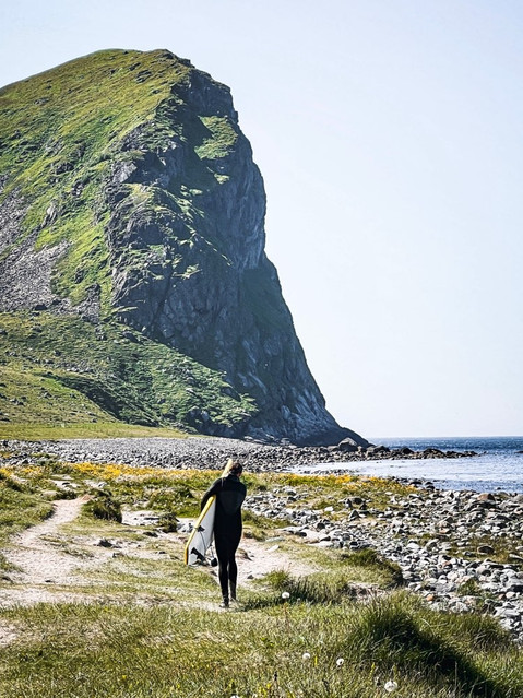 Ich habe für heute keinen weiteren Plan und lasse mich einfach treiben bei diesem Traumwetter. Zum wandern ist es mir tagsüber definitiv zu warm. Ich fahre ein bisschen durch die Gegend, nehme jeden Schlenker mit und lande mittags am Unstad Beach. Das soll hier ein Surf-Mekka sein, aber leider haben wir heute so gut wie keine Wellen. Das Arctic Surf Café vor Ort behauptet übrigens, die weltbesten Zimtschnecken zu haben. Das werde ich doch mal testen. Obwohl es hier dieses hippe Surfercafe gibt, hat Unstad mit seinen knapp 30 Einwohnern irgendwie noch etwas Ursprüngliches. Es verirren sich nicht viele Leute hierher und man kann hier so richtig runterkommen.