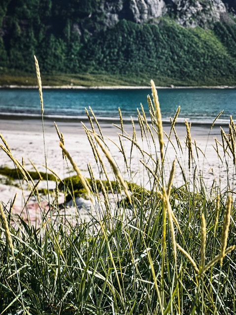 Am späten Nachmittag fahre ich wieder los, weiter Richtung Süden. Zuerst mache ich aber noch mal einen einstündigen Umweg, um dem Tipp einer Instagramerin zu folgen. Der Weg dahin ist für norwegische Verhältnisse recht öde und ich überlege wirklich schon wieder umzukehren. Ich fahre aber doch durch und dann stehe ich da und mir fallen mal wieder die Augen aus. Mal wieder unfassbar schön, was da vor mir liegt. Brennviksanden - ein Traumstrand mit Dünen, den schönsten Blumen, schneeweißem Sand, sehr cool geformten Bergen drumherum und einem Foto des Königpaars auf dem Thron.💩 Hier ist die Welt noch in Ordnung und die Sonne kommt auch wieder raus. Das hätte ich hier nun wirklich nicht erwartet. Jammerschade, dass man hier nicht mit dem Camper stehen darf. Ich wäre sofort geblieben.