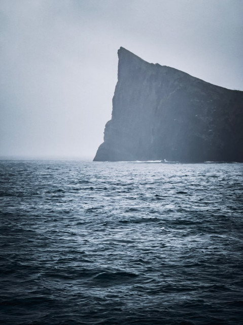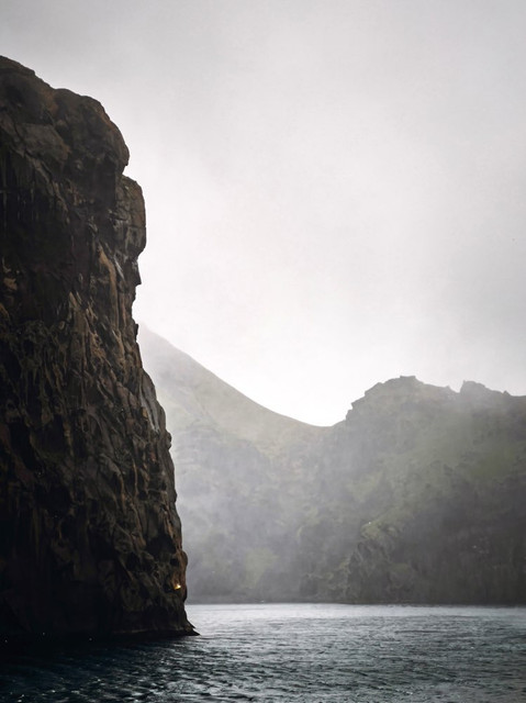 Ich beschließe heute Abend noch auf die Westmännerinseln überzusetzen. Da ist das Wetter zwar auch ätzend, aber morgen soll es besser werden. Auf der Fähre wundere ich mich über die Kotztüten, die überall ausliegen, und die Kojen, wo sich jeder reinlegen kann. Die Überfahrt dauert doch nur 40 Minuten. Kaum sind wir aus dem Hafen raus, weiß ich warum…🤢 Ich bleibe auch bei dem Sauwetter die ganze Zeit an Deck, Blick immer schön auf den Horizont. Die Einfahrt in den Inselhafen ist auf jeden Fall schon mal spektakulär. Auf der einen Seite knallgrüne Klippen, die an Irland erinnern, auf der anderen Seite reines Vulkangestein. Größer könnte der Unterschied nicht sein.